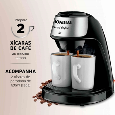 A cafeteira preta smart coffee c-42-2x-bi prepara 2 xícaras de café ao mesmo tempo. Ela acompanha 2 xícaras de porcelana e colher dosadora, tem porta-filtro permanente, que dispensa filtro de papel, e bandeja antiderrapante. Compacta, ela prepara 2 cafés de 120 ml ao mesmo tempo: o café fica pronto rapidamente, direto na xícara. Seu porta-filtro permanente é mais econômico, ecológico e sustentável por ser lavável. Já a tampa basculante traz mais facilidade na hora de colocar a água e o pó de café. Sua bandeja antiderrapante evita que as xícaras escorreguem e é removível, mais fácil de limpar. Além disso, a cafeteira smart coffee c-42-2x-bi tem proteção contra superaquecimento. Ela é super prática de usar: basta usar a colher dosadora, escolher 1 ou 2 xícaras e pronto! Em instantes você terá café quentinho. Ela foi desenvolvida para uso doméstico, sendo melhor para uso residencial. Tudo isso com 1 ano de garantia mondial. A mondial é a escolha de milhões de consumidores.